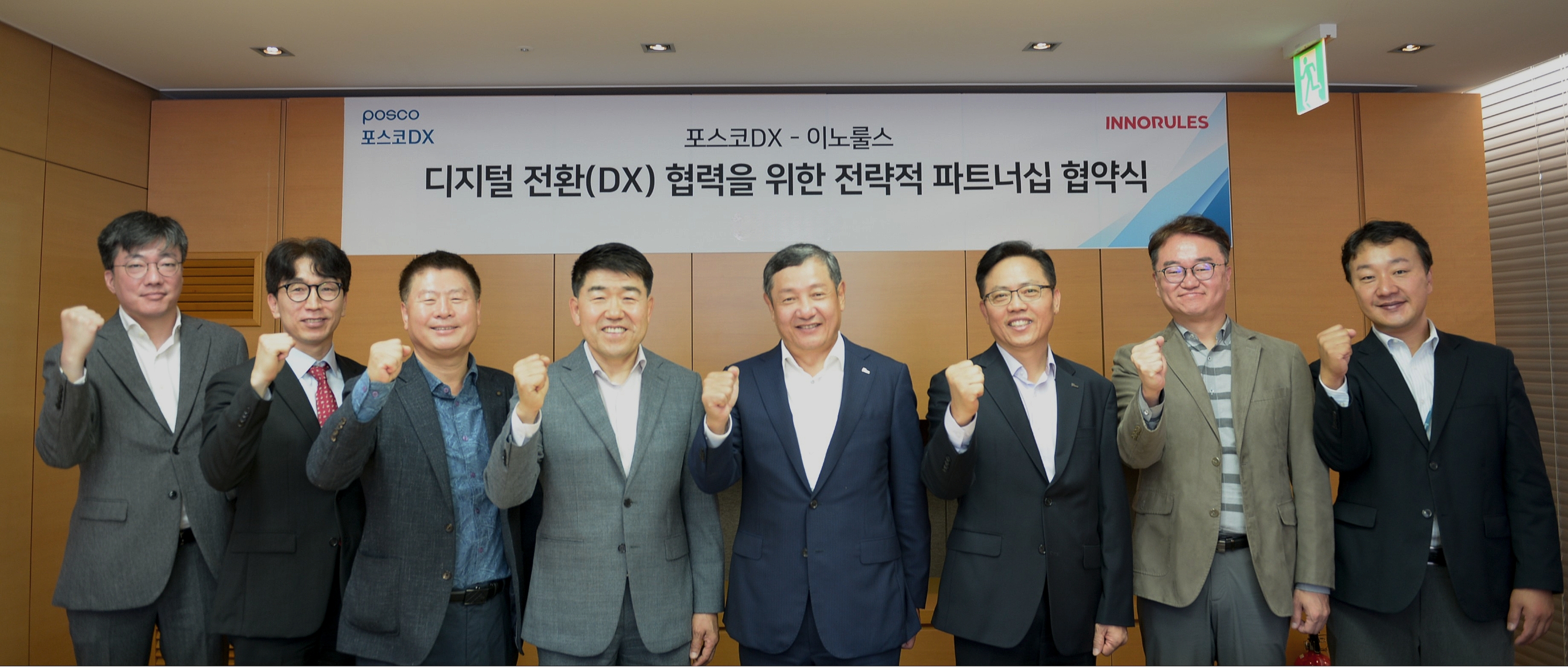 설명: 이노룰스와 포스코DX가 디지털 전환(DX) 협력을 위한 전략적 파트너십을 체결했다.